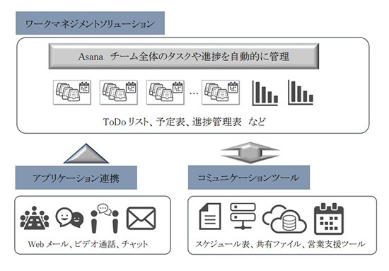 Asanaは、チーム全体のタスク整理やプロジェクトの進行状況について、ToDoリスト、予定表、進捗管理表などを自動で作成し、リアルタイムに可視化するクラウドサービス。ウェブメール、ビデオ通話、チャット、グループウェア、営業支援ツールなどのよく利用されるアプリケーションと連携ができ、チーム内で利用しているコミュニケーションツール、スケジュール表や共有ファイルなどから関連する業務や情報を抽出して自動的にリストや管理表を作成する。