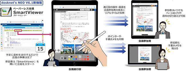 desknet's NEOのスケジュールに添付された会議資料を用い、それぞれの参加者がスケジュールからSmartViewerを開くことで、進行役が開いている資料やページめくりなどの操作を手元の端末でリアルタイムに確認できる。対面型の会議のほか、各種ウェブ会議ツールと組み合わせても利用でき、紙の利便性を失うことなく効率的なペーパーレス会議を実現できる。