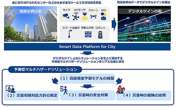 今回の協業では、各社が保有する空間・災害・人流などのデータや災害予測モデルを連携させ、デジタルツイン技術を活用した高精度の災害予測シミュレーションを行うとともに、シミュレーションにもとづいた安全対策、災害発生時の補償などについて検討する。