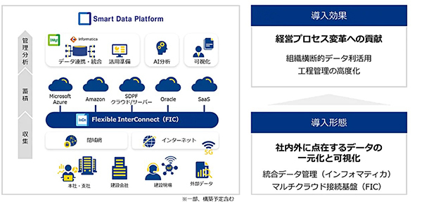 導入にあたっては、SDPFのインターコネクトサービス「Flexible InterConnect(FIC)」により、鹿島が利用する複数のパブリッククラウドサービスをセキュアかつ柔軟に接続できるマルチクラウド接続基盤を提供する。さらに、「Informatica Intelligent Cloud Services」を含むSDPFの「インフォマティカソリューション」の機能を活用し、社内外に点在する経営データ、IoTデータ、オープンデータ、BIMデータなどを連携・統合させることで、SDPF上で組織横断的なデータの利活用を可能にした。
