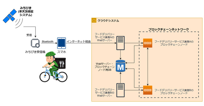 今回採択された提案は、フードデリバリーサービスの配達員の運転情報と保険料を連動させる保険システム。みちびきによって配達員の運転情報の収集を行い、ブロックチェーン(分散台帳)上で共有する運転実績に基づき、ブロックチェーンによるスマートコントラクト(あらかじめ設定された条件に沿って自動的に契約執行する)によって保険料を自動変動させるというものだ。