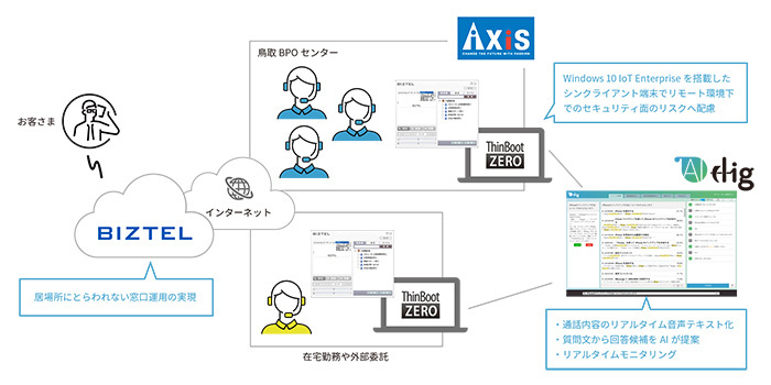 S&Iでは、アクシスのBPOセンターのリニューアルにあたり、クラウド型コールセンター/CTIシステム「BIZTEL」、Windows 10 IoT Enterpriseを搭載したセキュアな端末「ThinBoot ZERO」、AI利用の応対支援サービス「AI Dig」を導入。セキュリティに考慮したBPO業務の在宅化とBCP対策の強化を図った。また、オペレーターのスキル平準化と応対品質の向上、アフターコールワークの効率化を実現した。