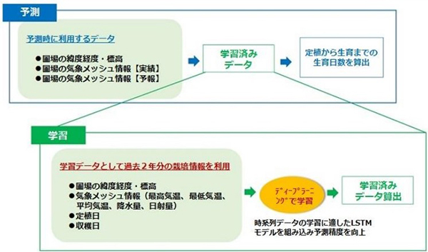 実証プロジェクトの取り組みの一つ「AIを活用したレタスの生育予測システム」では、生産者であるトップリバーでの実証結果を受け、21年度にトップリバーの御代田農場である富士見農場で本格運用を開始。実際の定植日と生育予測による収穫予定日がガントチャート形式で一覧表示が可能で、生育予測による出荷量の見通しが一目で分かるようになったほか、将来の過不足の情報も把握可能となった。
