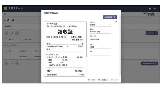 大量の証憑をまとめて保管する場合も、スムーズな操作性で画像登録や検索タグ追加などを一括処理できる。また、大臣シリーズでの伝票作成と連動。どちらかで起票または登録することで、証憑とのリンクが自動的に設定される。