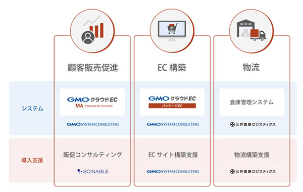 ECサイト構築支援では、GMOクラウドEC パッケージECとMAツール「GMOクラウドEC MA Powered by Scinable」の機能制限版によって通常版価格の最大66%オフを実現。物流構築支援では、三井倉庫ロジスティクスがGMOクラウドEC パッケージECと連携する倉庫管理システムをバリューセット向け特別価格で提供する。販促コンサルティングでは、シナブルがGMOクラウドEC パッケージECと連携可能な「GMOクラウドEC MA Powered by Scinable」を迅速に導入するための施策立案を支援することに加えて、コンサルティングサービスのバリューセット向け特別価格を提供する。