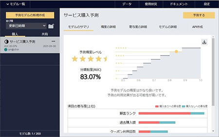 予測API機能では、Prediction Oneで作成した予測機能を予測APIを介して外部アプリケーションから簡単に呼び出すことができる。自社アプリケーションや自社業務システムに予測機能を組み込むことで、AIの活用の幅を大きく広げることができる。また、作成したAPIの運用をサポートする機能も搭載。APIの利用状況の確認機能、誤操作防止のための保護機能などによって、運用の利便性を向上している。