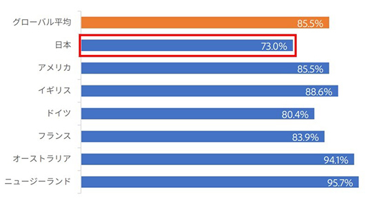 主な調査結果として、コロナウイルス感染症拡大の影響でテレワークを導入する企業が増える中、「テレワークによってワークライフバランスは向上したか」の問いに対して、「向上した」との回答はグローバル平均で85.5%、日本で73.0%だった。一方で、「オフィス勤務よりテレワークの方が仕事がはかどるか」の質問に、「そう思う」との回答はグローバル平均で69.1%だったが、日本は7カ国中で最も低い42.8%にとどまった。この点から日本は、テレワーク環境でオフィスほど仕事を効率的に行えていないことが分かった。