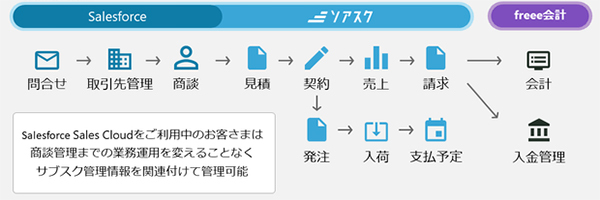 ソアスクは、サブスクリプションビジネス専門の「販売管理」機能をクラウドで提供するサービス。営業、バックオフィスの業務プロセスを自動化、見える化することで、企業の長期的な成長を支えている。