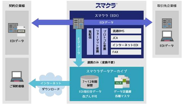 今回のスマクラ データアーカイブは、企業間のEDIデータを電子帳簿保存法の要件に応じて保存。各企業間で連携されているEDIデータをスマクラ データアーカイブに自動連携し、スマクラサービスプラットフォーム上でデータを保存する。企業の担当者は、インターネットを介し、保存データのダウンロードなどを行うことができる。