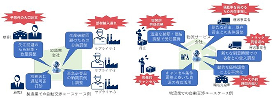 製造業では、予想を超えた製品需要の到来や必要部材の納入遅れに対応するための、取引先との納期や数量の調整などがユースケースの一例となる。また、物流業では、突発的な荷送依頼やトラック到着遅れに対応するための納期・価格などの調整や関係者との受入条件の調整などがユースケース例となる。