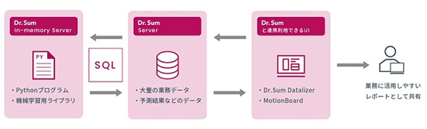最新バージョンでは、統計解析的手法や機械学習などのモデルを構築するためのライブラリーが豊富に揃っている「Python」との連携を実装。Python連携とDr.Sumの特徴であるビッグデータ処理技術の組み合わせにより、Pythonプログラムを大量の業務データやセンサーデータとシームレスに連携することができ、予測値の取得やプログラムの再学習を行うことが可能となる。