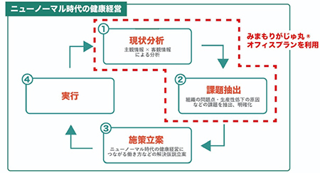 みまもりがじゅ丸オフィスプランは、リストバンド型バイタルセンサーで収集した脈拍の揺らぎから自律神経の状態を判断。心的ストレスを3段階(通常/軽いストレス状態/ストレス状態)で見える化する。脈拍から体温を予測し発熱状態などから社員のストレス状況をオンラインで把握が可能。企業として社員の心的ストレス状況のラインケアができ、健康経営に役立てることができる。