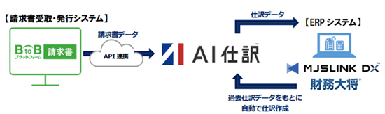 今回の連携により、BtoBプラットフォーム 請求書で作成・発行した請求書データと受け取った請求書データを、MJSLINK DX財務大将に直接取り込むことが可能となった。AI仕訳機能により、過去の仕訳データと照合した上で自動で仕訳を生成する。ユーザーは、請求書データを財務会計ソフトに転記する作業や勘定科目を選択する手間がなくなり、毎月の伝票起票の負担を大幅に削減できる。