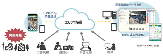 エリア情報サービスは、映像や画像を含む地域の情報をクラウドで一元管理することで、時間や場所を問わず情報の共有が可能となる。災害発生時には、IoT機器から収集した情報の活用や現場の映像や画像をスマートデバイスなどで撮影・登録することで、災害地域全体の状況を迅速に把握することができ、避難所や対策本部など離れた場所にいる職員ともリアルタイムに共有できる。