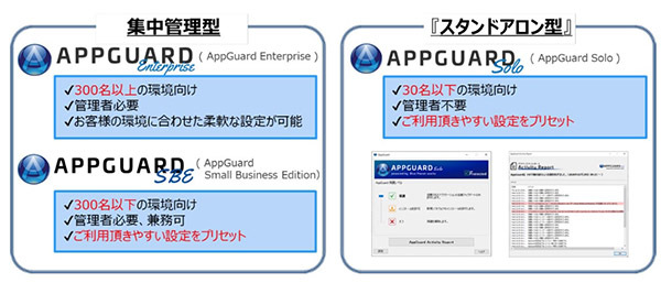 「OSプロテクト型」エンドポイントセキュリティ製品のAppGuardは、未知・既知を問わず、高度なサイバー攻撃によるエンドポイントの侵害を未然に防止。この技術は、20年ほど前から米国で開発が進められ、米政府機関などでの導入実績がある。日本国内では18年から販売を開始、8000社を超える企業に採用されている。7月現在、大手企業向け「AppGuard Enterprise」、中小・中堅企業向け「AppGuard Small Business Edition」、スタンドアロン版「AppGuard Solo」のシリーズを展開している。