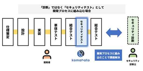 komabatoは、開発の進捗に合わせてセキュリティテストが必要な部分だけを開発者自らがその場で検査し、脆弱性がないかどうかを確認することができるツール。脆弱性検査を「開発プロセスの中で行うテストの一つ」と捉え直し、第三者による「セキュリティ診断」ではなく、開発者自身が主体的に行う「セキュリティテスト」として、開発プロセスへの組み込みを実現する。