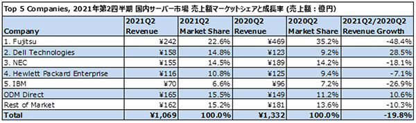 21年第2四半期の国内サーバー市場は前年同期比19.8%減の1069億円、IDC調査