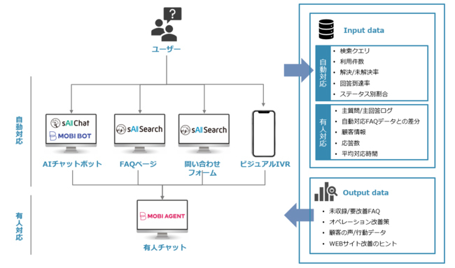 これにより、自動対応のAIチャットボットやFAQページから、有人対応のチャットサポートまで一貫して取得した顧客ログデータを基に複合的な分析を行い、システムやオペレーション改善へと反映させるサイクルを構築していくことが可能となる。