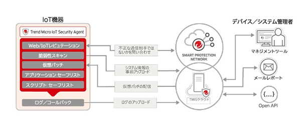 Trend Micro IoT Security(TMIS)は、トレンドマイクロが開発・販売するIoT機器向けのセキュリティソリューション。IoTデバイスのシステムでのセキュリティリスクを検知・特定し、防御することでシステムを保護する。TMISは、IoTデバイスに柔軟に組み込むことができ、複数機能による多重防御やクラウド監視との連携による迅速な防御の実現など、AIエッジコンピューティングデバイスへの組み込みで大きな利点を備えている。
