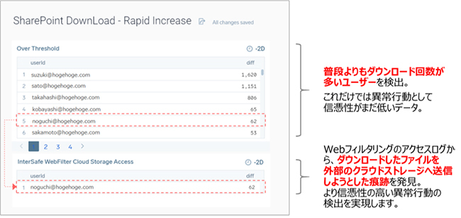 同オプションをクラウドの共有サーバー(SharePoint Online)に利用したユースケースでは、共有サーバー内の機密情報を扱うサイトから、普段よりも多くのファイルをダウンロードしたユーザーを検出する。さらに、ウェブフィルタリング(InterSafe WebFilter)のアクセスログを照合して、外部クラウドストレージへのアクセス形跡を調査する。複数のログを参照することで、機密データをダウンロードして外部に持ち出そうとしている可能性が高いと判断することができる。