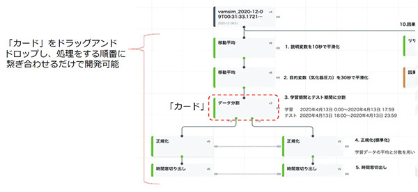 Node-AIの利用者は、データ分析を行う際にAIモデルが実行するデータの分割や正規化など処理ごとにコンポーネント化された「カード」をドラッグアンドドロップし、処理をする順番につなぎ合わせるだけで、直感的にAIモデルの作成が可能となる。従来、不可欠とされてきた高度なプログラミング知識は必要なくなる。