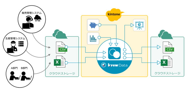基幹システムからクラウドストレージに出力されたCSV/Excelファイルをkintoneに取り込んで集計・加工を行い、クラウドストレージに出力するまでを自動化。krewDataがkintoneと基幹系/情報系システムの境目をなくすことで、ユーザー企業はkintoneをDX基盤に必要な情報共有プラットフォームとして活用できるようになる。