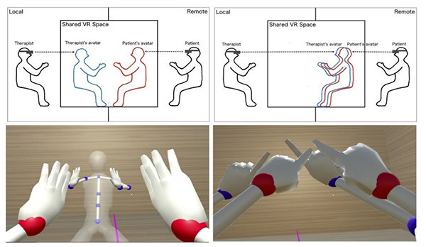 幻肢痛VR遠隔セラピーシステムは、離れた拠点にいる幻肢痛患者とセラピストが、同じVR空間内で位置関係や動作を共有しながらコミュニケーションをとることで、患者がセラピストを対面訪問しなくても、どこでもセラピーを受けられるようにする仕組み。