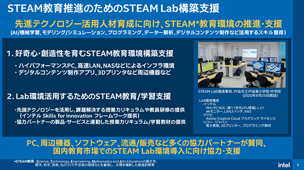 さらに、インテルが実施するSTEAM Labの普及促進を目的とした学校/教育機関への実証研究に協力し、同実証を通してパターンごとの最適な機器やアプリケーション環境の確立を行う。また、PBL学習(問題解決型学習)に向けた研修など活用の支援と導入促進に向けた提言活動を実施する。なお、実証校の応募に関しては、10月23日から11月25日までインテルウェブサイトで募集を行う。