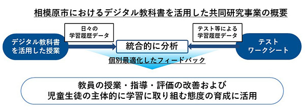 共同研究は、相模原市教育委員会が取り組む「GIGAスクール等オンライン学習環境の活用」に関する事業の一環。デジタル教科書を中心とした国語の学習活動で得られた学習履歴データを活用し、児童生徒が主体的に学習に取り組む態度の育成につながる学習方法を研究する。デジタル教科書やテストで取得される学習履歴データを統合的に分析し、教員の授業・指導・評価の改善、児童生徒の主体的な学びの育成に活用していく。
