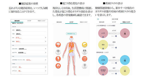 健康支援サービス(MIRAMED)は、健診結果や生活習慣に関するアンケート結果などから健康状態や生活習慣関連疾患のリスクを分かりやすく図式化するなどして、特定保健指導対象者(対象者)の気付きを促し、健康意識の向上を図るサービス。また、健康状態や生活習慣の改善に向けた日々の目標設定や達成状況を保健師などの指導担当者と共有し、指導やアドバイスを日々の行動に役立てることで取り組みの継続を支援する。さらに、遠隔面談やチャット機能を活用した非接触での特定保健指導も実施できる。