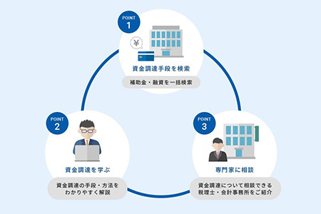 資金調達ナビは、事業を営むうえで必要不可欠な資金調達を「探す」「学ぶ」「相談」できる完全無料サービス。「資金調達手段の探し方がわからない」「資金調達について学びたい」「資金調達の専門家に相談したい」という人々に向けて有益な情報を提供する。