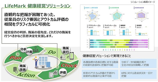 LifeMark 健康経営ソリューションは、点在する従業員の健康情報を集約し、東京大学大学院医学系研究科・川上憲人教授の研究室と共同開発した独自のアルゴリズムによる分析を行うことで血圧や睡眠時間などのリスク要因の変化がアウトカム評価に及ぼす影響を予測するシミュレーションが可能となる。