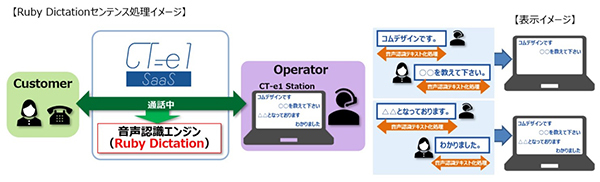 CT-e1/Speech to Textのセンテンス認識では、コムデザインがもつ音声加工技術でカスタマーとコミュニケーターの通話中の無音を検知し、音声認識処理を行う。これにより、リアルタイム性の高い音声認識結果が出力される。
