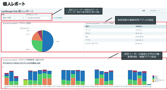 標準Appとして提供する「労務可視化」では、従業員のPC操作ログを収集し、ウェブブラウザー、メール、スクリーンセーバー(放置時)、Officeアプリ、エクスプローラー(ファイルを探している時間)など、それぞれの利用割合や利用時間を可視化する。ダッシュボードは、個人単位とグループ単位で変更することができる。