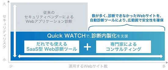 Quick WATCHは、ユーザー企業によるセキュリティ人材の確保や専門的な運用体制がなくても自社運用でWebサイトの安全な管理ができるように支援するもの。優先度が低く診断対象外だったWebサービスへの診断を自社で内製化することが可能となり、費用の抑制と時間短縮を実現しながらWebサイトのサイバーリスクが低減できる。ラックとAeyeは、保険・金融・サービス・食品・消費財メーカーなどの大手企業から順次提供。大手製造業や中堅規模の企業への提案にも取り組む。
