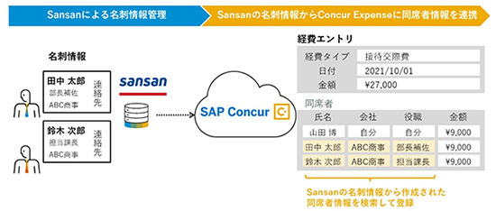 機能連携によって名刺情報がConcur Expense上に取り込まれ、経費精算申請時に「同席者情報」として検索・登録が可能になる。正確な人物情報である名刺情報を同席者情報として利用することで申請時の誤入力や不正を防ぐほか、承認者は信頼性が担保されたデータをもとに承認が可能になる。