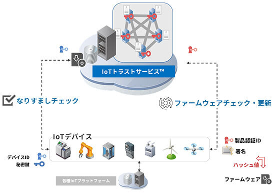 同サービスでは、ブロックチェーン技術を応用した電子証明システムにより、運用中のIoTデバイスとファームウェアに、なりすましや改ざんが行われていないか定期的にチェックし正当性を証明する。OTA(無線経由)によるファームウェアの自動更新も可能。