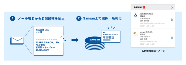 また、名刺候補として表示される企業名は、公開企業情報から補完できる。メールからSansan上に蓄積可能な情報は、基本項目の「会社名/氏名/メールアドレス」に加えて「部署/役職/電話番号」など。名刺交換で得た情報と同様にSansan上に接点データとして自動で名寄せされる。なお、2022年初旬にMicrosoft Outlookとの連携も予定している。