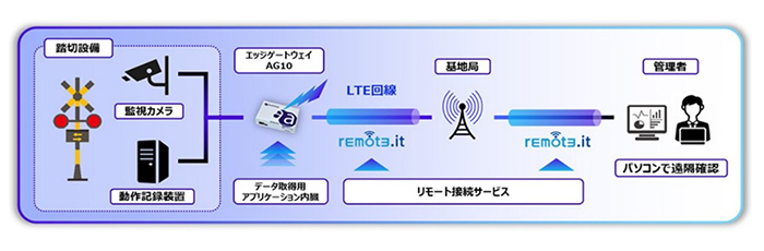 踏切遠隔状態監視システムは、踏切設備から取得した動作記録や監視カメラの映像を、ソフトバンクのLTE回線を利用して伝送する。具体的には、踏切設備の動作記録装置と監視カメラを、アムニモが提供するLTE回線対応エッジゲートウェイ「AG10」に接続し、さらにソフトバンクが取り扱うリモート接続サービス「remote.it(リモートイット)」(remot3.it提供)を利用して、管理者のPCへデータや映像を伝送する仕組みになっている。