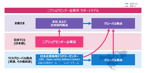 ニアショアセンター@東京は、IT人材の不足に悩む日本企業の顧客に向けて、TCSグローバルのオフショアチームと連携し、グローバルリソースやアプリケーションの運用保守サービスを最適なコストで柔軟に活用してもらうための窓口として機能する。24時間365日対応で複数のシフトを組むことで、顧客の事業展開や各国の現地時間にも対応する。当初はアプリケーション・マネジメント・サービス(AMS)から開始し、随時、提供サービスを拡充していく。