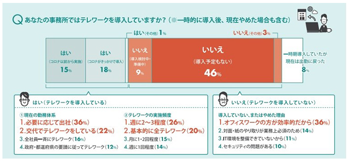 調査の結果、現在はテレワークを導入していると回答した事務所が、全体の約3割となった。テレワークを導入している頻度は「週に2~3程度」が最も多く、次いで「基本的に全テレワーク」だった。