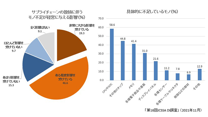 コロナ禍の影響で発生しているサプライチェーンの毀損で、半導体を中心にモノ不足が進んでいるといわれているが、実際、経営にどの程度影響を及ぼしているかについてJCSSA会員企業各社に聞いた。その結果、65.9%が「影響を受けている」と回答。うち19.3%が「非常に大きな影響を受けている」とした。具体的にどのようなモノ不足が発生しているかについては、「CPUやSOC」が58.6%と最多。次いで「その他ICチップ」が44.8%、「メモリ」が41.4%と続いた。モノ不足への対策としては「調達先との緊密な交渉」が79.3%と最も多く、「代替品への切り替え」(51.7%)、「新たな調達先の開拓」(36.2%)と続いた。