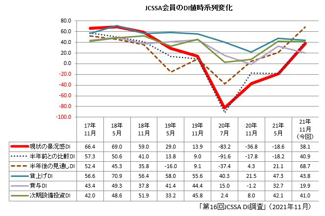 各種景況感判断については、軒並み前回調査を上回った。「現状の景況感現状の景況感DI」は38.1と、前回(2021年5月実施)比で56.7ポイント増。「半年前との景況感比較DI」も40.9と59.1ポイント増、「半年後の景況感見通しDI」も68.7と47.6ポイント増だった。景況感に関するDI値は、いずれも大幅に改善した。緊急事態宣言が解除され、感染者の急減に伴うコロナ禍終息への期待感が数値に現れた。