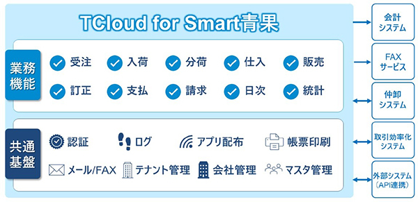 TCloud for Smart 青果は、長年培った業界ノウハウを凝縮した青果卸売業向けのクラウドサービス。必要な基本機能を網羅したほか、標準化を考慮した設計により業務の属人化を解消する。また、働き方改革への対応と、BCP対策を実現する。