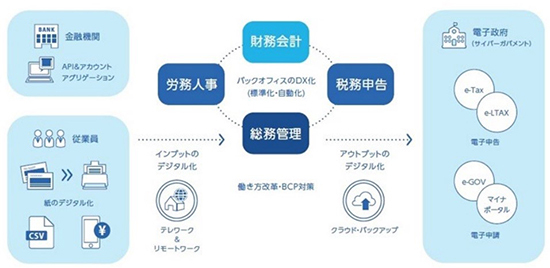 財務顧問 R4/財務応援 R4とSmartGo Stapleの連携システムは、経費申請・承認・経理処理・振込といった経費精算業務の効率化やキャッシュレス化を実現。経費データを日次や月次で財務システムに連携できるため、経理担当者は改めて財務システムにデータを入力する手間が省ける。支払いから電子申告までを一気通貫で行うことができる。