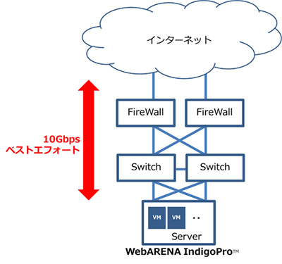 また、インターネットからクラウドサーバー間を上り/下りトラフィックともに最大10Gbpsの広帯域なベストエフォートのネットワークで接続し、サーバーへのアクセス集中時や大容量データ通信時も快適に利用できる。