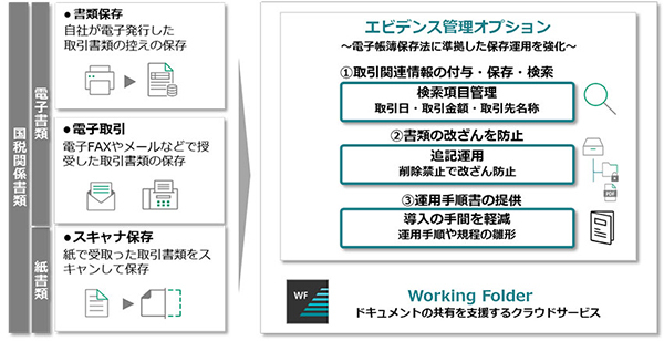 主な機能は、「取引関連情報の付与・保存・検索」「書類の改ざん防止」「運用手順書の提供」など。ユーザー企業は、国税関係書類の授受から保存までの一貫した管理が可能となる。富士フイルムBIでは、Working Folder」ですでに社内や外部の組織と安全に文書を取り交わす機能を提供しているが、今回、新たにWorking Folder エビデンス管理オプションを加えることでユーザー企業による電子帳簿保存法の改正要件に準拠した運用を支援する。