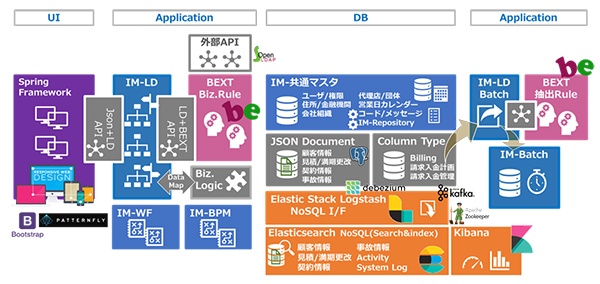 BIMsは、ビジネスとシステムの要となる処理フロー、データベースをそれぞれドキュメント構造のコンポーネントとして扱うことで、急な要件変更や機能拡張にも柔軟に対応するフレームワーク。intra-martを基盤とし、ビジネスロジック作成ツール「IM-LogicDesigner」によるSOA・マイクロサービス定義の可視化と、B-Prostのビジネスルールエンジン「BEXT」を活用したことで、可視化されたノーコード、ローコード開発を可能とした。