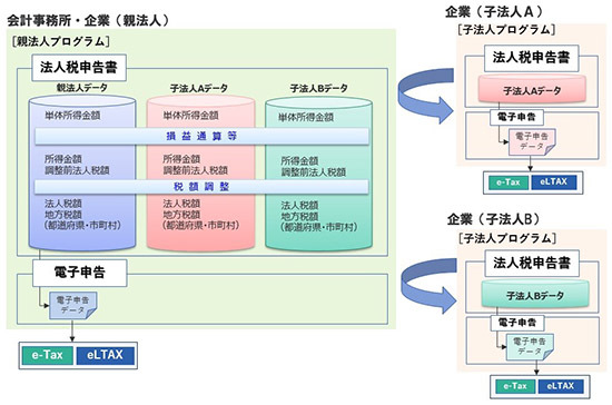 グループ通算制度対応では、親法人用プログラムと子法人用プログラムを提供する。親法人と子法人の各データで所得などの必要情報を入力後、親法人データに子法人データを連動して損益通算処理を行い、通算結果を子法人データに戻す。親法人側で全法人分の申告書を作成することもできる。