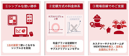 工場を安定して稼働させるためには、設備の日々の保全業務が重要となる。MENTENAは、保全業務を紙やエクセル管理からシステム管理(スマートフォン入力やデータベース)へ移行することで、現場作業の効率化や点検履歴の効果的な管理を行えるようになる。また、クラウド設備保全システムであるため、設備保全業務の見える化を実現する。